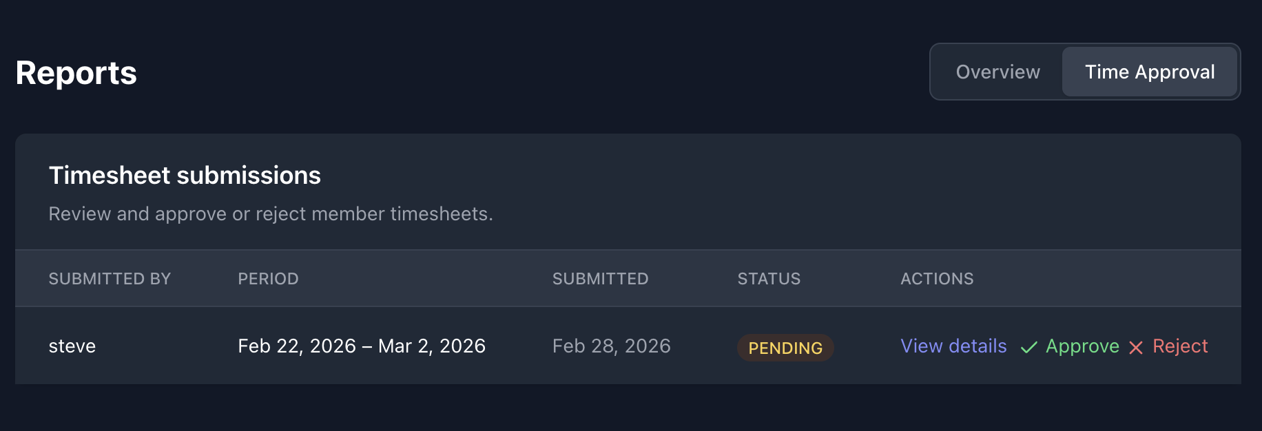 Member status emails — Team members receive an email when their time sheet is approved or denied. This setting can be toggled per member based on your team's preferences.